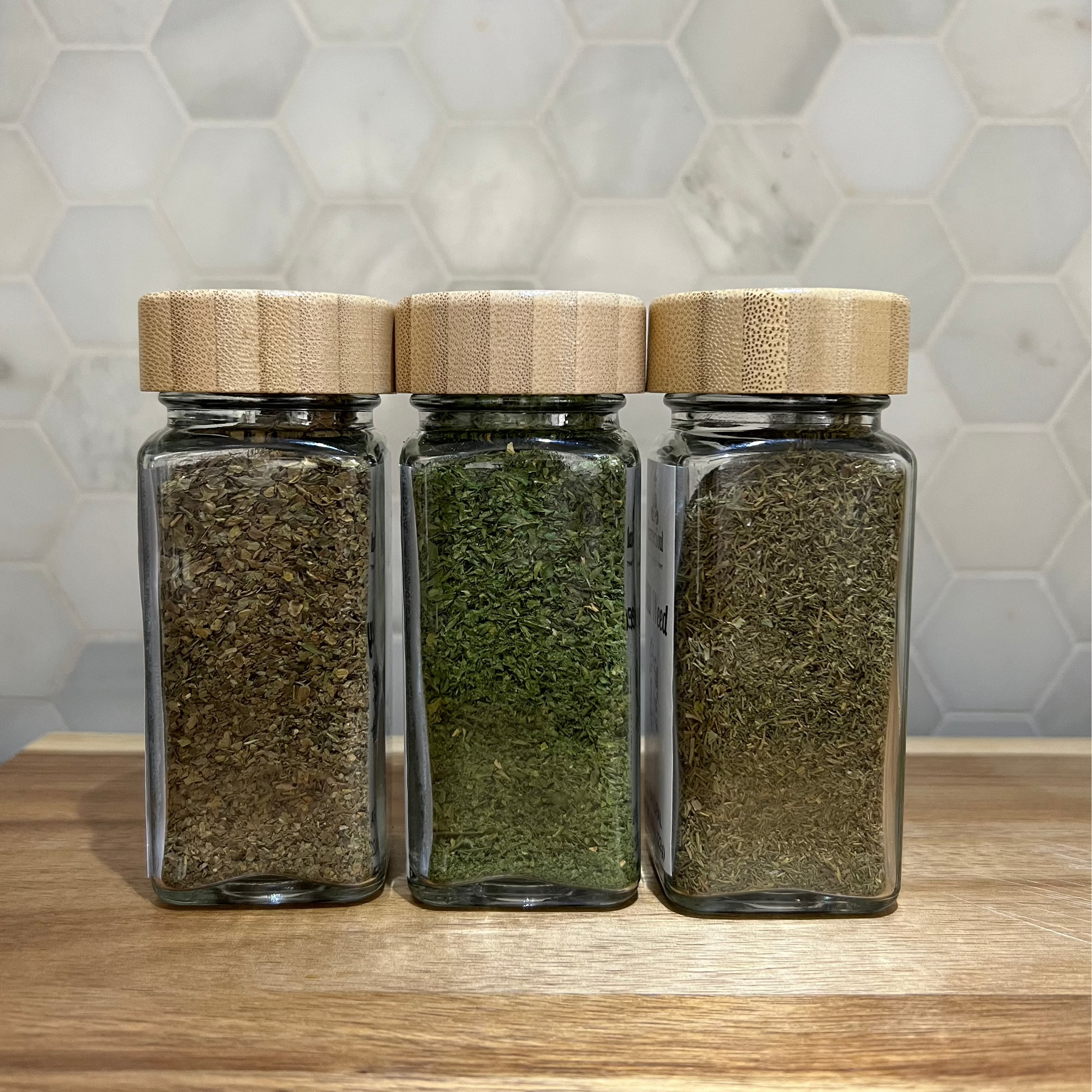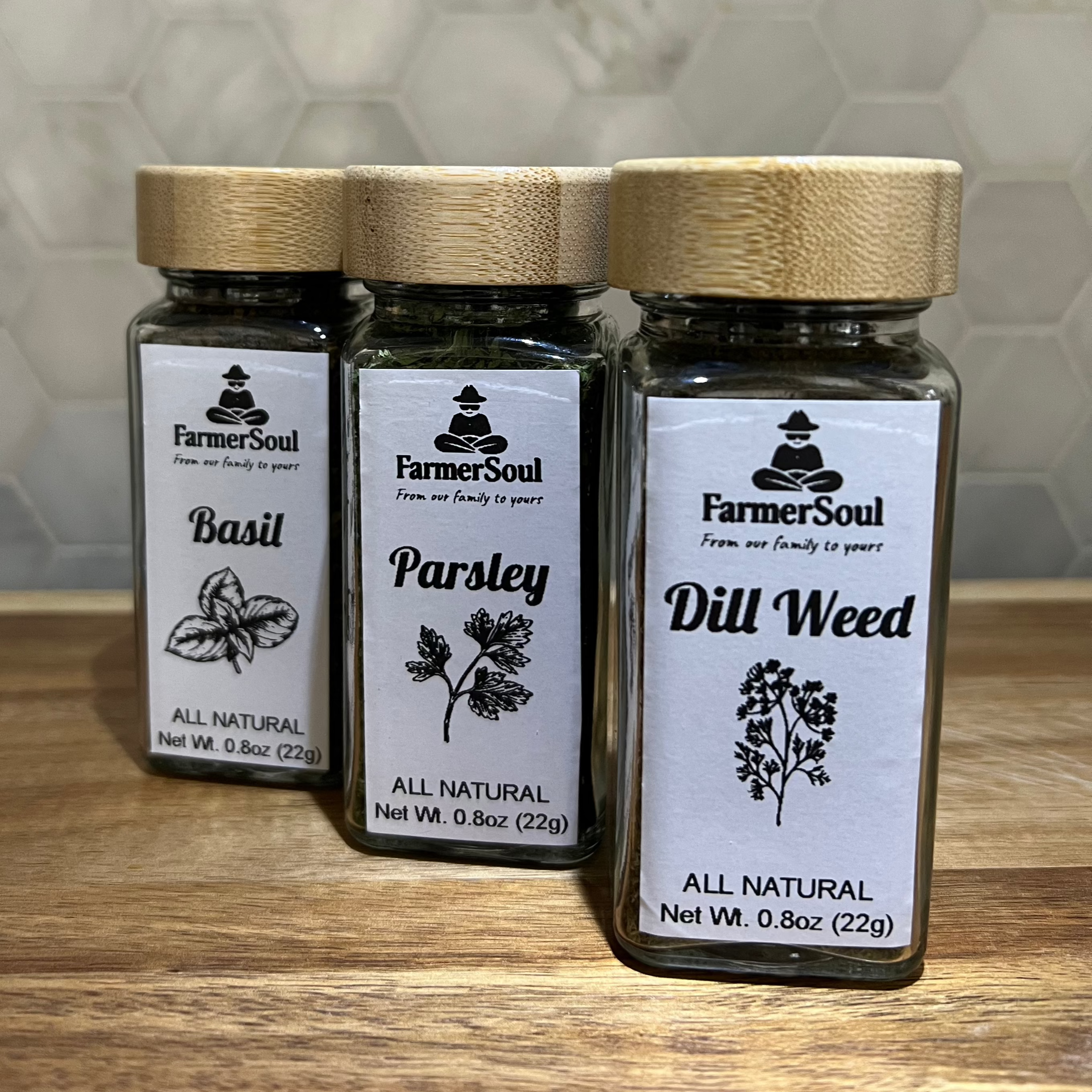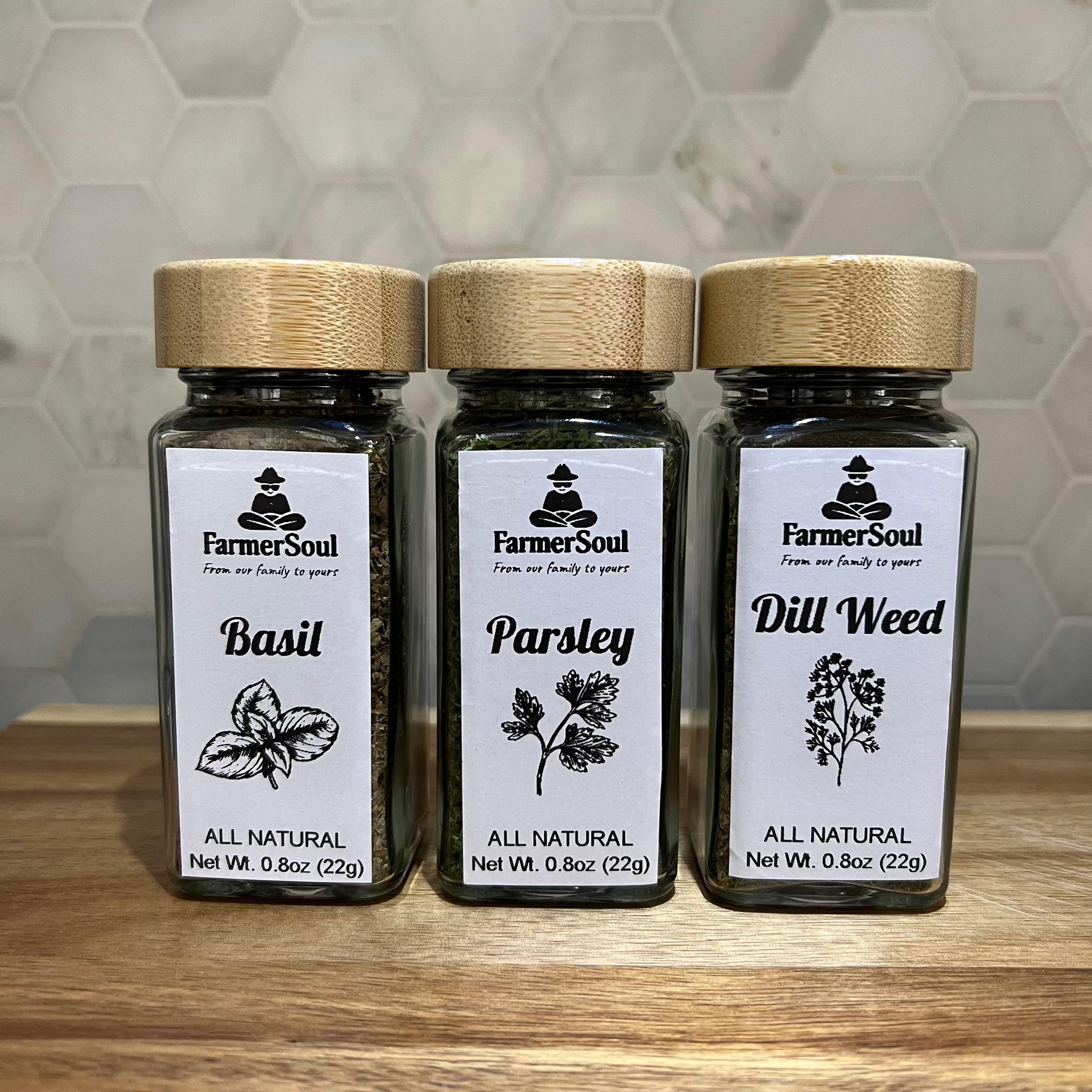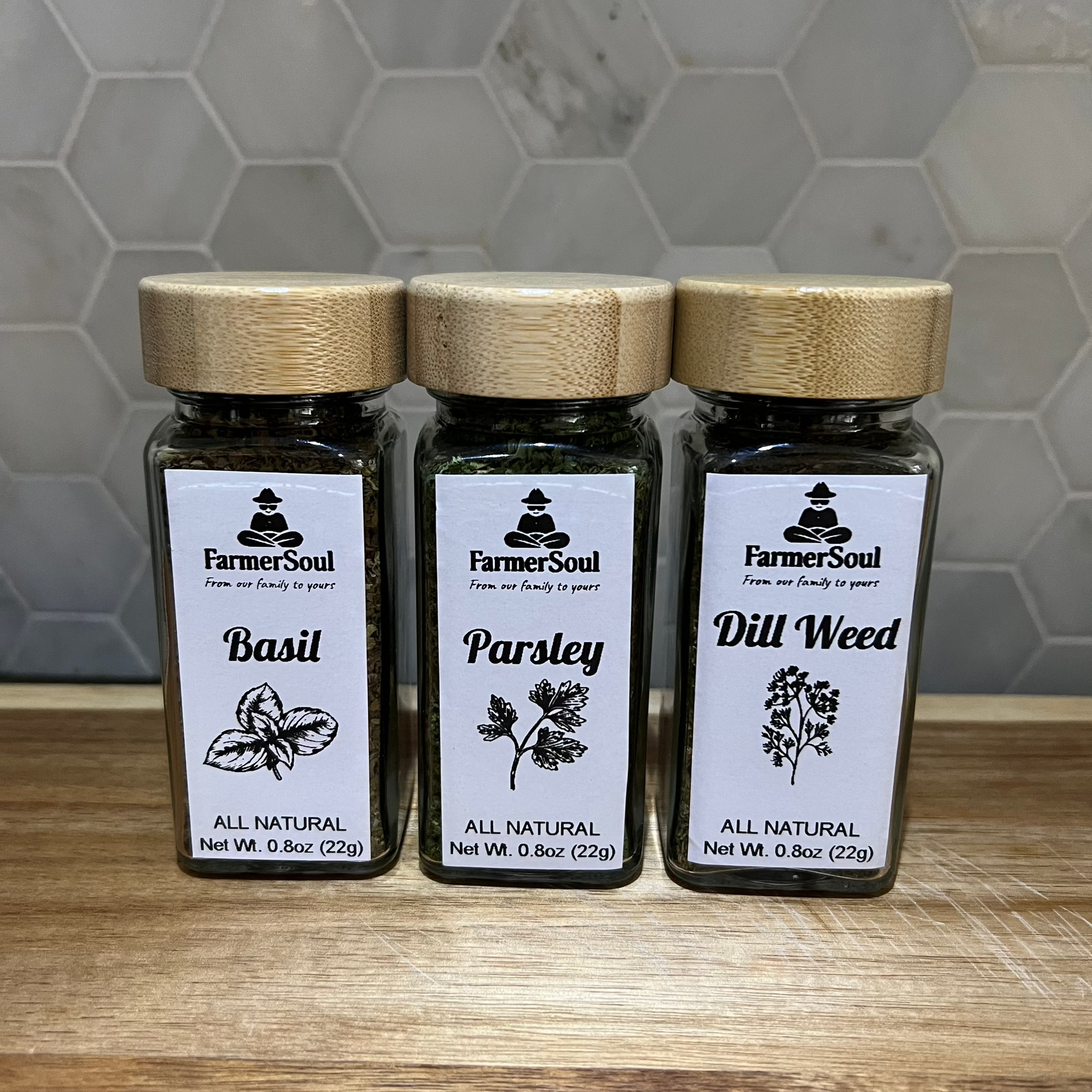 This set includes three of our most popular spices - basil, dill, and parsley - each hand-selected and packaged in beautiful glass spice jars with bamboo lids. It's the perfect way to add a burst of fresh flavor to all your favorite dishes.