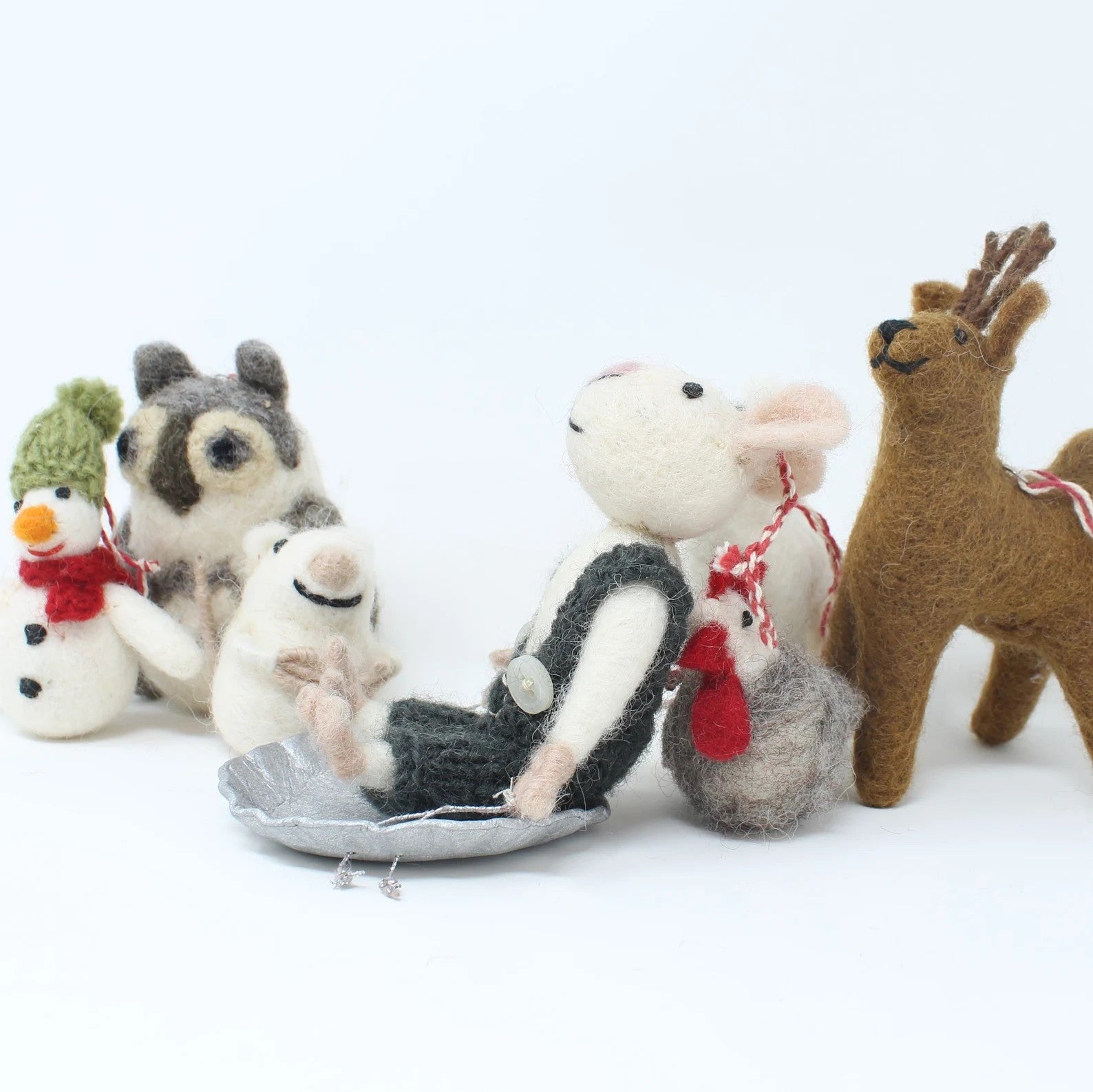 Dress your tree this year with these exceptionally made felted wool Christmas ornaments, Owl, Deer, Reindeer, Mouse on Sled, Little Mouse, Rooster, and Dressed Snowman!